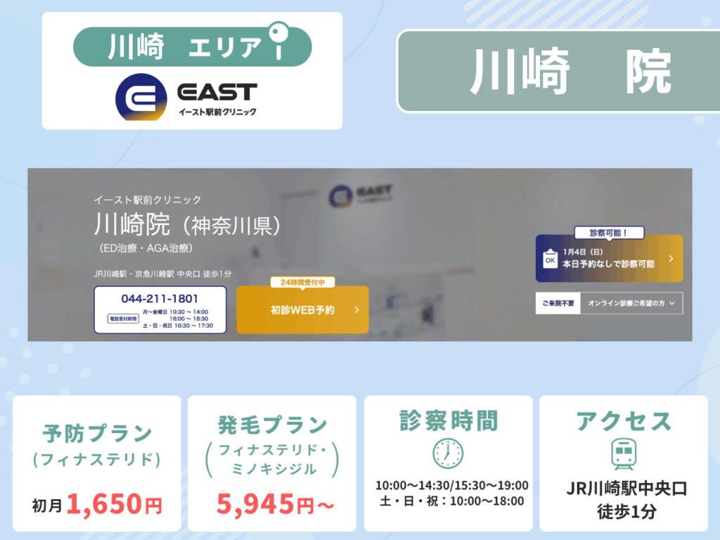 中でもイースト駅前クリニック川崎院は、事前予約なしであなたのスケジュールに合った相談ができる手軽さが評判で、AGA治療で悩んでいる人でも通いやすい環境が特徴になります。