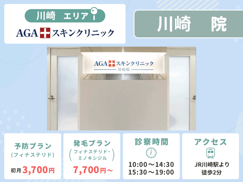 2つ目の川崎エリアにあるAGAクリニックは、川崎駅周辺で通院しやすい立地で比較がおすすめです。