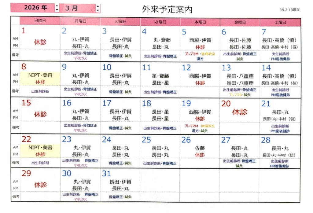 3/24(火)及び3/26(木)は、伊賀医師お休みのため、医師の変更等がありますのでご了承ください。