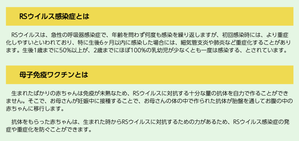 2026年4月1日より、当院においてもRSウイルスワクチン(アブリスボ)の公費接種が可能となります。 【対象】 妊娠28週0日~36週6日の妊婦さん 【接種方法】 自治体より交付された予診票をご持参のうえ、事前にご予約をお願いいたします。 【予診票について】 君津市・木更津市・富津市・袖ケ浦市にお住まいで、予診票をお持ちでない方は受付までお申し出ください。 その他の地域にお住まいの方は、お住まいの市区町村へお問い合わせください。